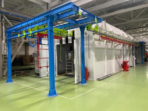 3-секционная проходная камера с внутренними габаритами 12200х4000х3000 мм. Стальная каркасная конструкция с сэндвич-панелями, прессованный настил, решетки для потолочных фильтров. Распашные ворота двухстворчатые 2000х2500 мм. 4 сервисные двери. Вытяжной вентиляционный агрегат с производительностью 60000 м3/ч. Приточно-вытяжной вентиляционный агрегат для окрасочной камеры с производительностью притока и вытяжки по 10000 м3/ч.